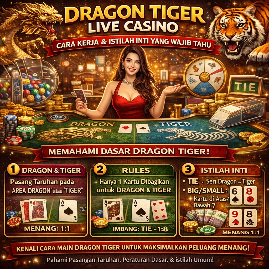 Dalam Dragon Tiger, beberapa istilah inti yang sering kamu lihat antara lain: Dragon (sisi kartu naga), Tiger (sisi kartu harimau),